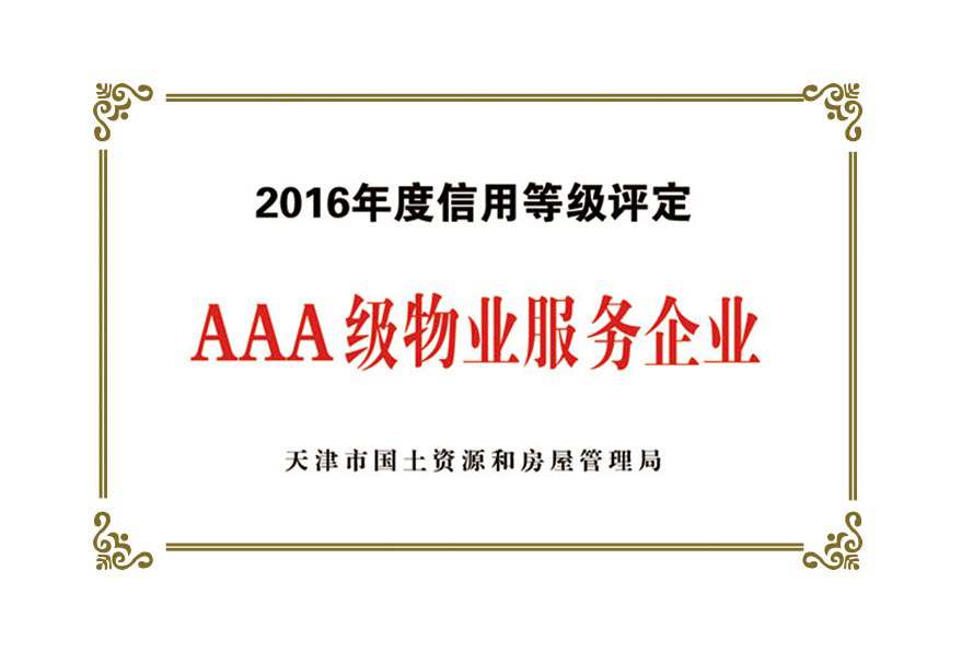 公司目前被授予:中國保安協會理事單位、物業管理綜合實力入圍企業、天津市物業協會理事單位、天津市保安協會常務理事單位、天津市保潔協會明星企業、天津市科技小巨人企業、天津市科技型企業、天津市物業管理企業優秀項目經理、企業信用評價體系AAA級企業、AAA級誠信經營示范單位、AAA級重合同守信用單位、2017年被天津市工商業聯合會評為天津市民營企業促進就業百強企業、社會捐贈百強企業、2018年銷售收入百強企業,2020年被天津市退役軍人事務局評為天津市吸納退役軍人就業先進單位。